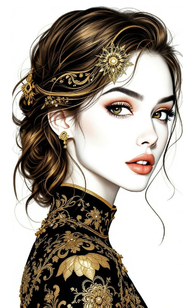 A striking portrait of a young woman depicted entirely in shades of gold, black, and white, capturing her essence with a minimalist yet powerful aesthetic. Her features are elegantly defined with bold black outlines, while her hair cascades in flowing waves, shimmering in rich gold tones that contrast beautifully against the stark white background. The woman's expression is one of serene confidence, with her eyes glistening in deep black, drawing the viewer's gaze. Her attire, subtly embellished with intricate patterns in gold, hints at elegance and sophistication. The overall composition creates a captivating harmony between light and shadow, embodying a timeless beauty that resonates with the viewer.