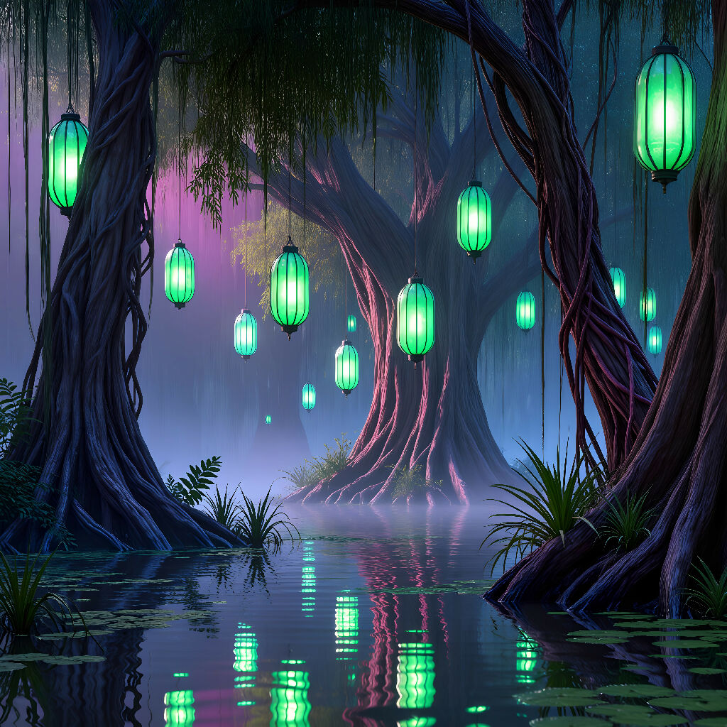 A vast lake where trees emit bioluminescence from their glowing fruits.