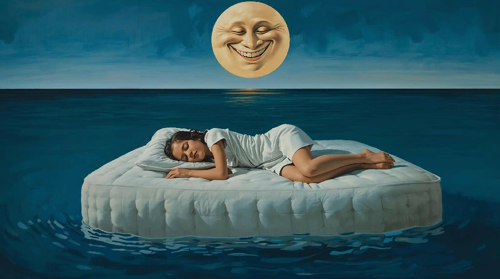 Surreal painting of a woman peacefully sleeping on the ocean underneath a whimsical moon.