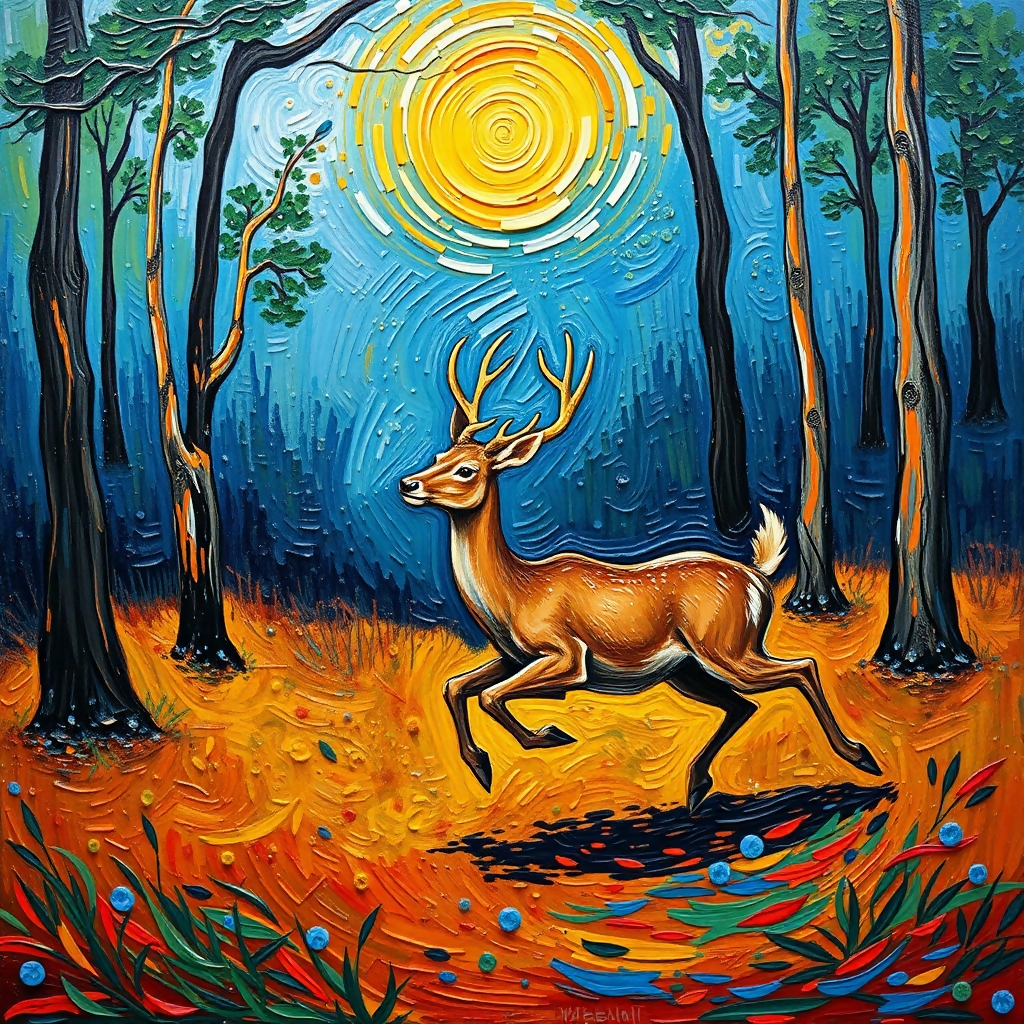 This dynamic image captures a deer mid-stride as it gracefully races through the forest. Sunlight filters through the dense canopy, illuminating the sleek lines of the deer’s body and highlighting its agility. The lush greenery blurs into a backdrop of motion, emphasizing the creature's speed and vitality. Every detail—from the tension in its muscles to the flick of its ears—evokes a sense of freedom and raw energy, celebrating the untamed spirit of nature.