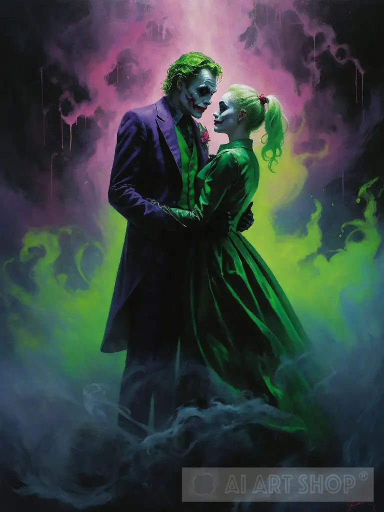 In a swirling cloud of toxic green, the doomed dance of the Joker and Harley Quinn unfolds. Their twisted love story is reflected in their eerie, poison-tinged auras, sending a shiver down the spine of anyone who dares to witness their chaotic chemistry. This haunting image captures a moment of tension and passion between the two iconic characters from the DC universe. The scene is depicted in a beautifully detailed painting, showcasing the intricate details of their costumes and expressions. The vibrant colors and dynamic composition add depth and emotion to the portrayal, making it a truly unforgettable piece of art.