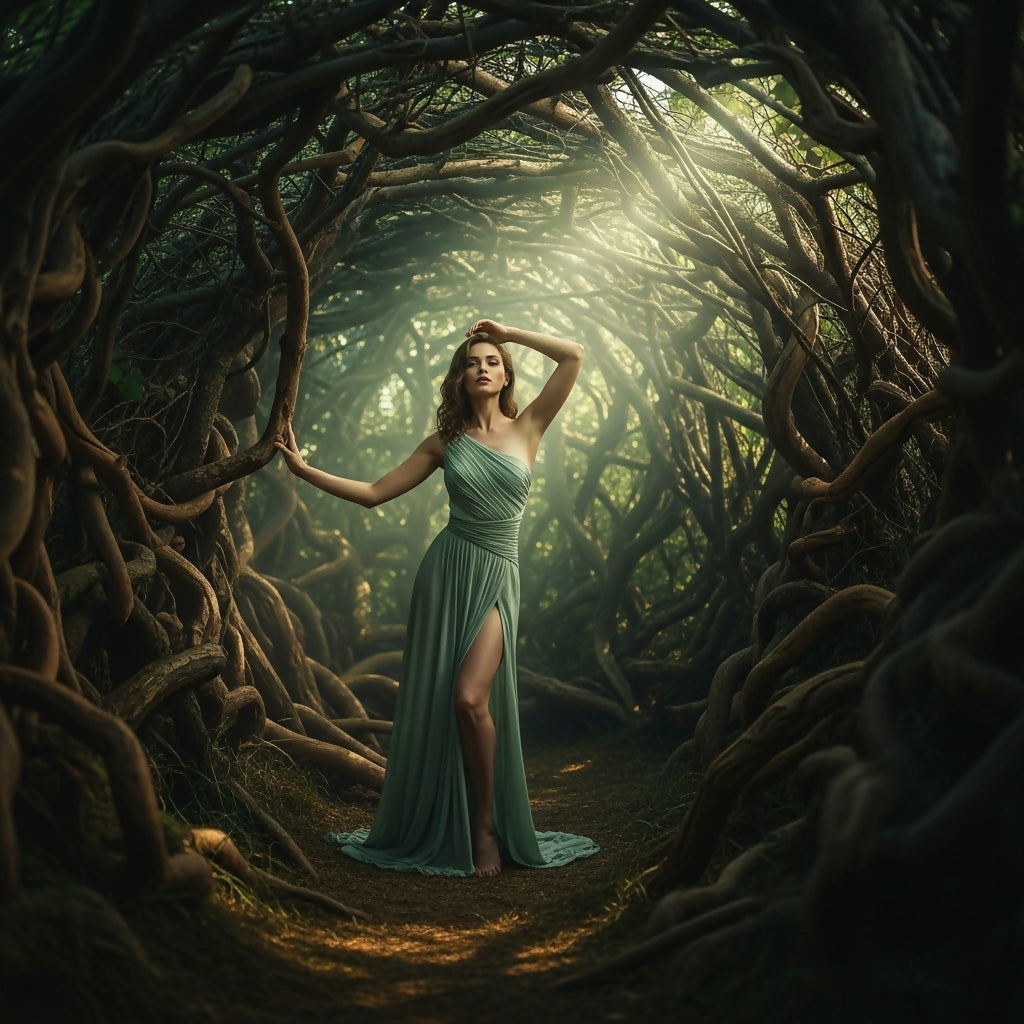 A graceful woman in a flowing gown stands amidst an ancient, root-filled forest, bathed in ethereal light.