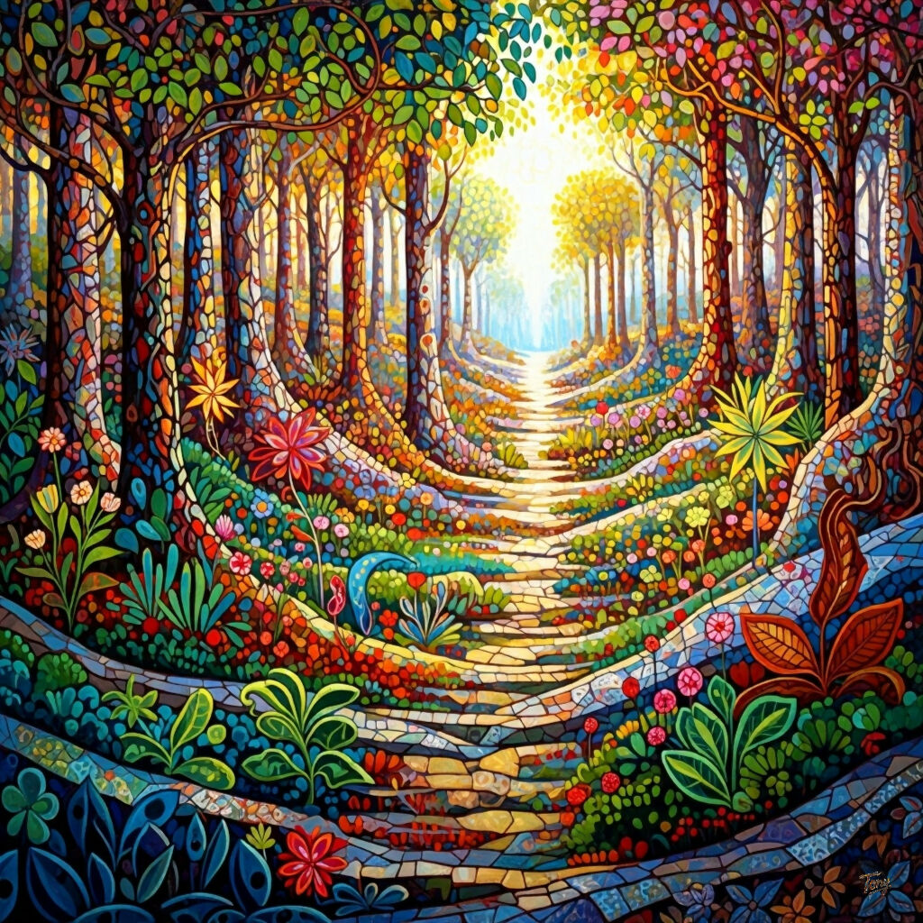 This painting depicts a vibrant, mosaic-style forest path leading toward a brilliant light source in the distance. The trees are composed of countless small, multi-colored shapes, with trunks and branches that twist and curve in whimsical patterns. The leaves are a kaleidoscope of warm and cool tones, from vivid greens and yellows to deep reds and purples.