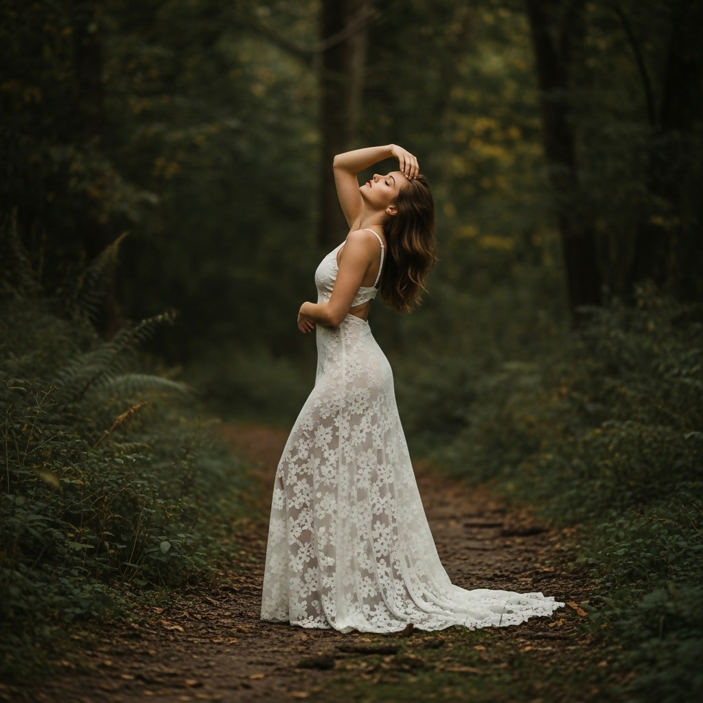 A graceful woman in a flowing white lace gown stands on a forest path, basking in a moment of serene contemplation with closed eyes.