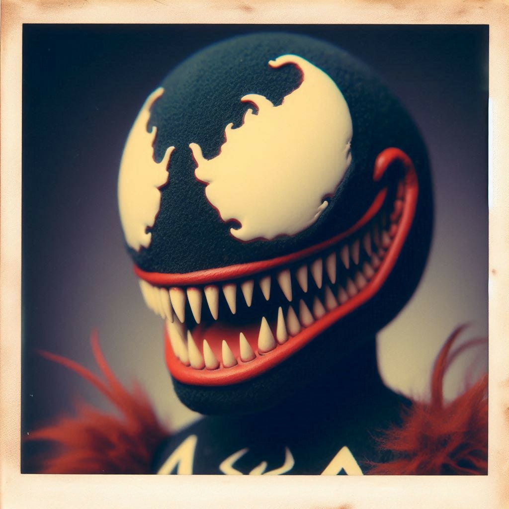 The image shows a stylized figure resembling the character Venom from the Marvel Comics universe. The figure has a large, black head with white, jagged eye patches and a wide, toothy grin with sharp, pointed teeth. The mouth is outlined in red, adding to the menacing appearance. The figure's body is partially visible, adorned with a white spider emblem on the chest. The background is blurred, focusing attention on the figure's face. The image is framed with a vintage, slightly worn border, giving it a retro or nostalgic feel. This detailed and artistic representation captures the essence of Venom's intimidating and iconic look.