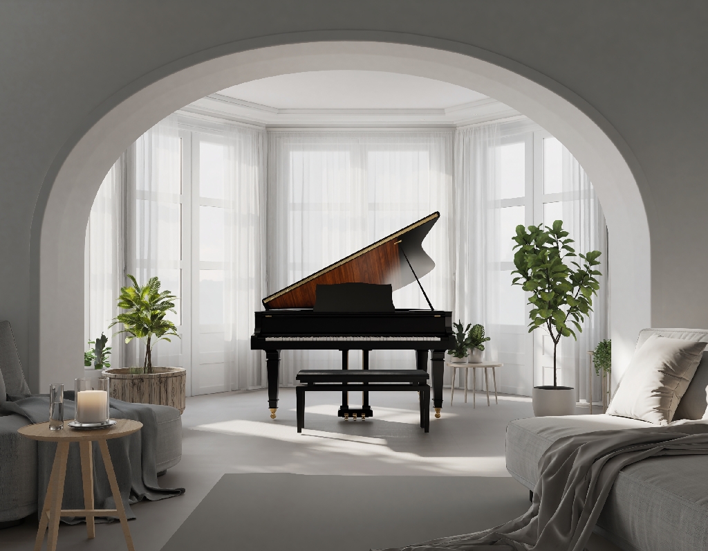 At the heart of a sunlit room stands a grand piano, bathed in soft daylight streaming through sheer curtains.