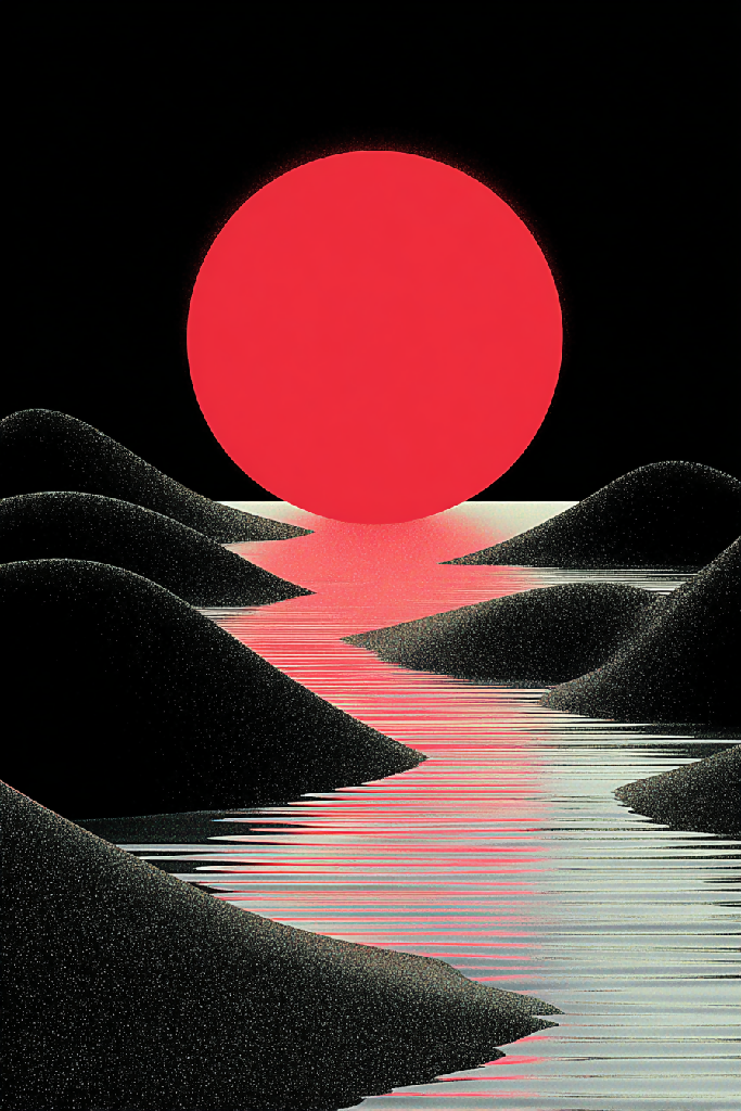 A striking visual series exploring surreal landscapes under the gaze of a bold red sun. Each composition features undulating black terrain and a reflective, dreamlike river that guides the viewer’s eye toward the celestial focal point. The interplay of minimalism, neon gradients, and cosmic symbolism evokes a futuristic yet meditative atmosphere.