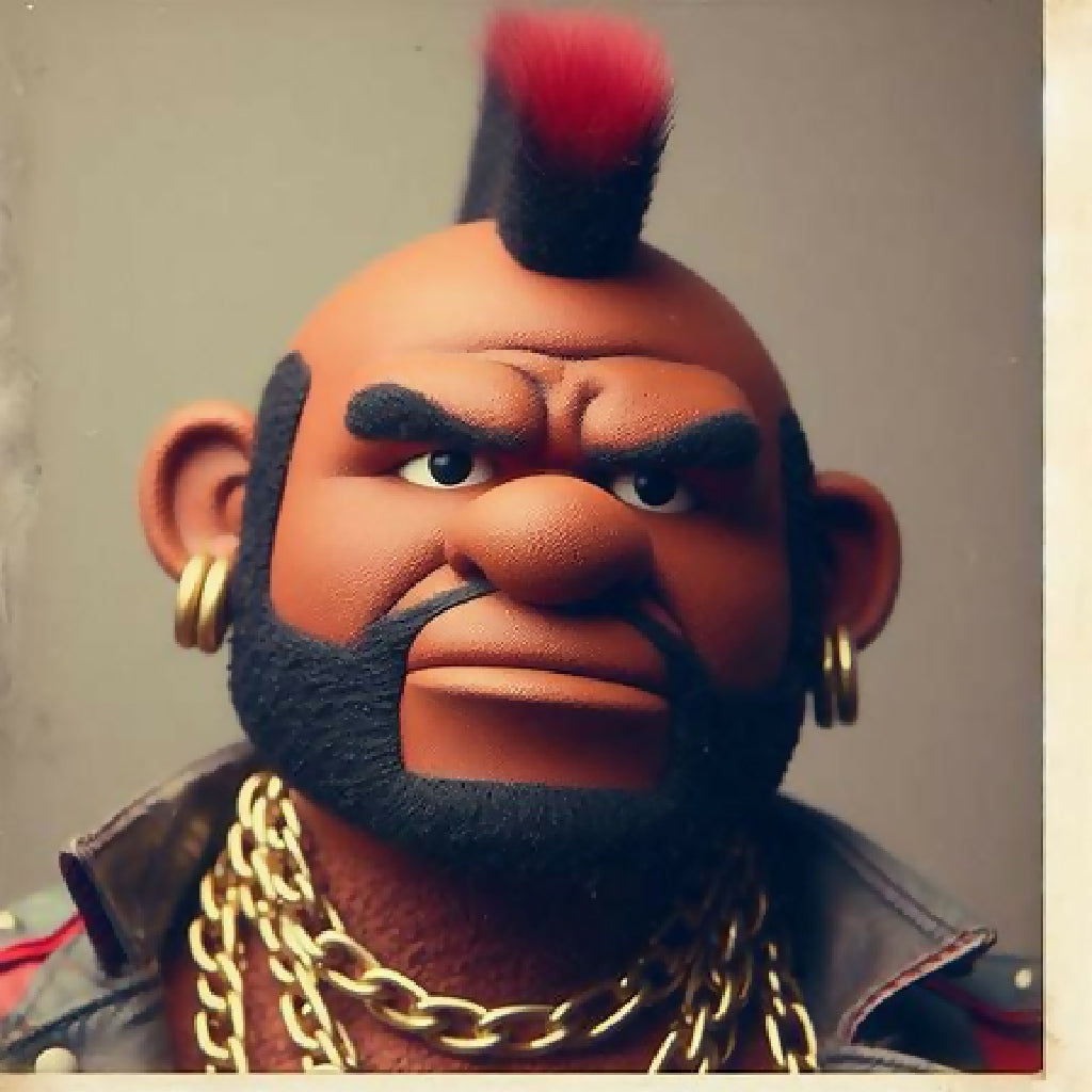 The image shows a person with a distinctive hairstyle, specifically a mohawk with a red tip. The person is adorned with multiple gold chains around their neck and has large gold hoop earrings. They are dressed in a leather jacket with visible studs. The face is blurred out, making it unidentifiable. This unique and bold fashion style is reminiscent of Mr. T, a well-known public figure famous for his role in the TV series "The A-Team." Mr. T is known for his iconic mohawk, gold jewelry, and tough-guy persona. This image captures that memorable style perfectly.