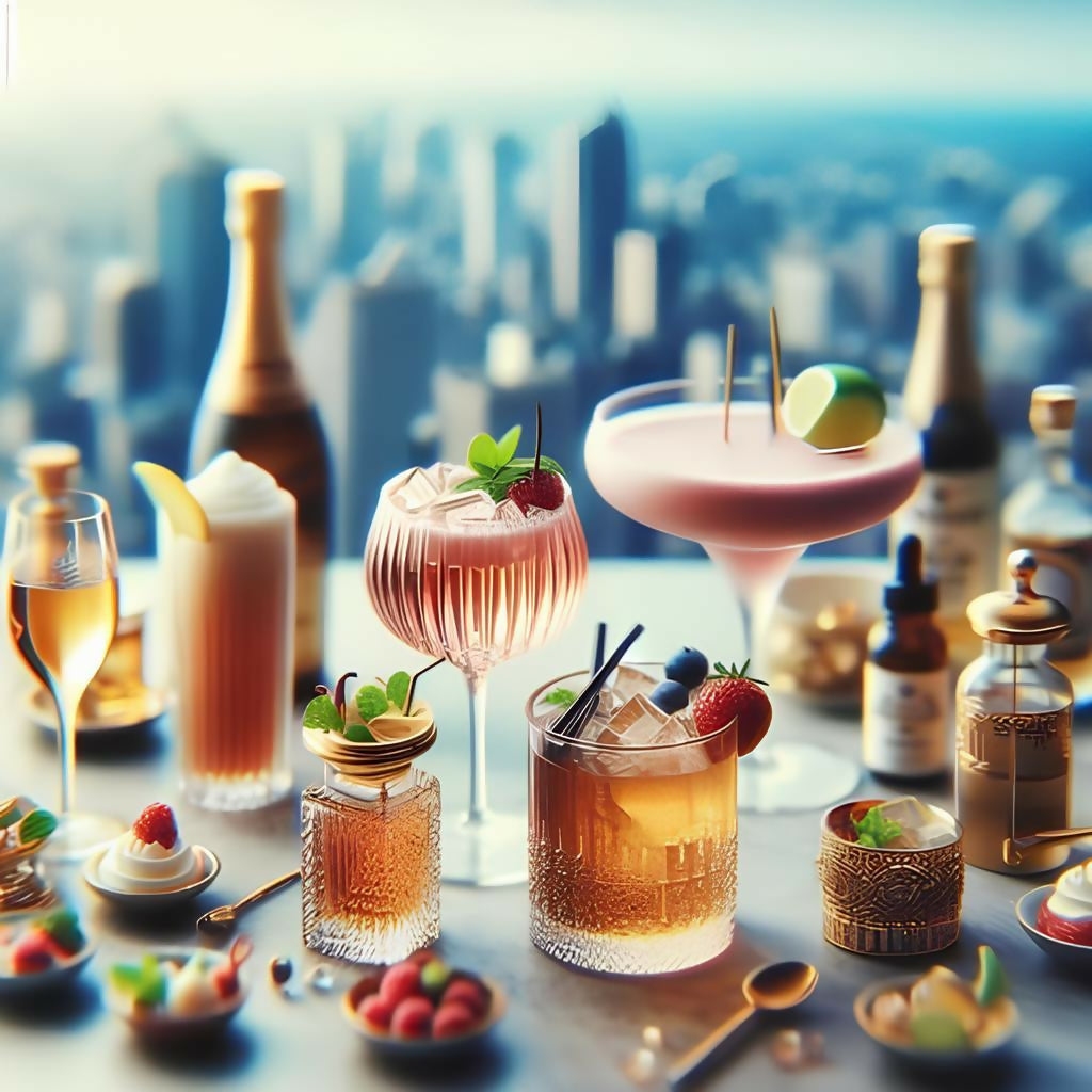 An artistic image capturing a luxurious table set with sophisticated drinks — fine wines, elegant cocktails, and sparkling glasses arranged with style. Perfect for conveying class, celebration, or upscale moments. Ideal for lifestyle, hospitality, or gourmet-themed visuals.