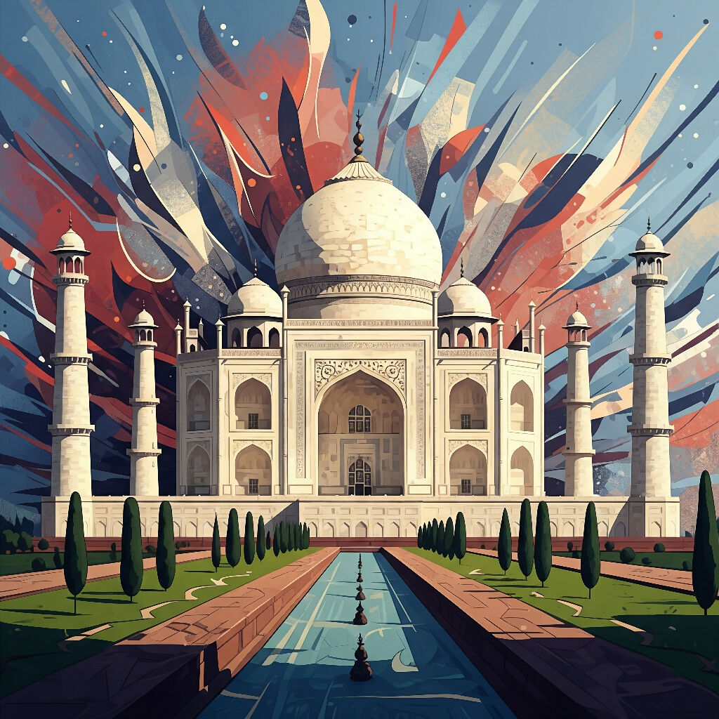 This is a vibrant and stylized digital painting of the Taj Mahal. The iconic white marble mausoleum stands prominently at the center, depicted with its grand dome, minarets, and intricate architectural details. In front of the structure, the classic reflecting pool stretches out, flanked by perfectly manicured green lawns and rows of slender cypress trees. The most striking element is the background, which features an explosion of abstract shapes and colors in shades of red, blue, and white, radiating outwards from behind the Taj Mahal, giving the impression of energy or a dynamic sky. The overall style is modern and artistic, blending traditional imagery with a contemporary, energetic aesthetic.
