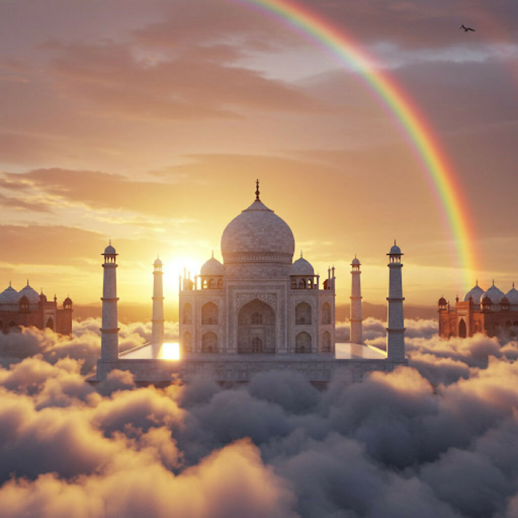 An image of the Taj Mahal in the clouds with a beautiful rainbow.
