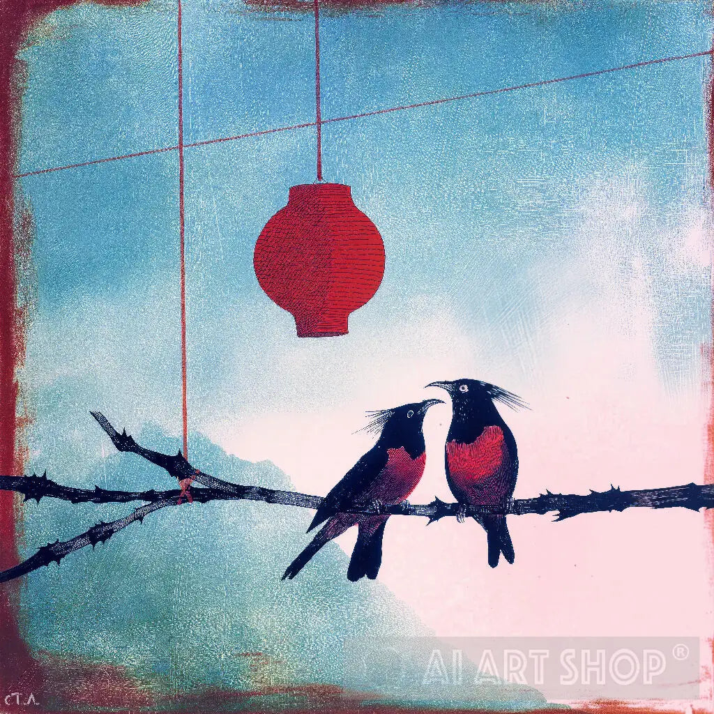 Two birds with black and red plumage are depicted on a branch under a red, lantern-like object hanging from above, all set against a sky with hues of blue and pink. The birds appear to be in conversation, highlighted by the serene and softly colored backdrop. The image conveys a tranquil yet vibrant atmosphere, with the lantern adding a cultural or symbolic touch to the scene.