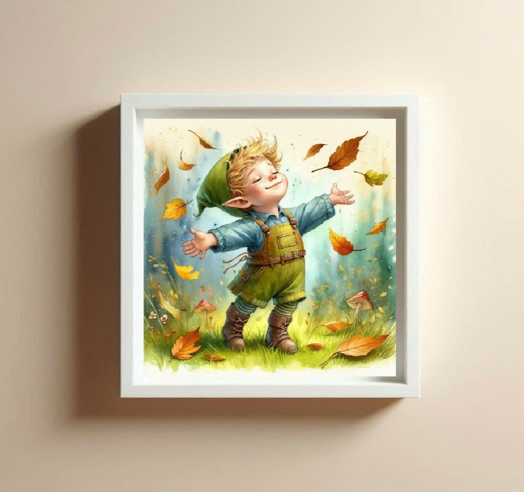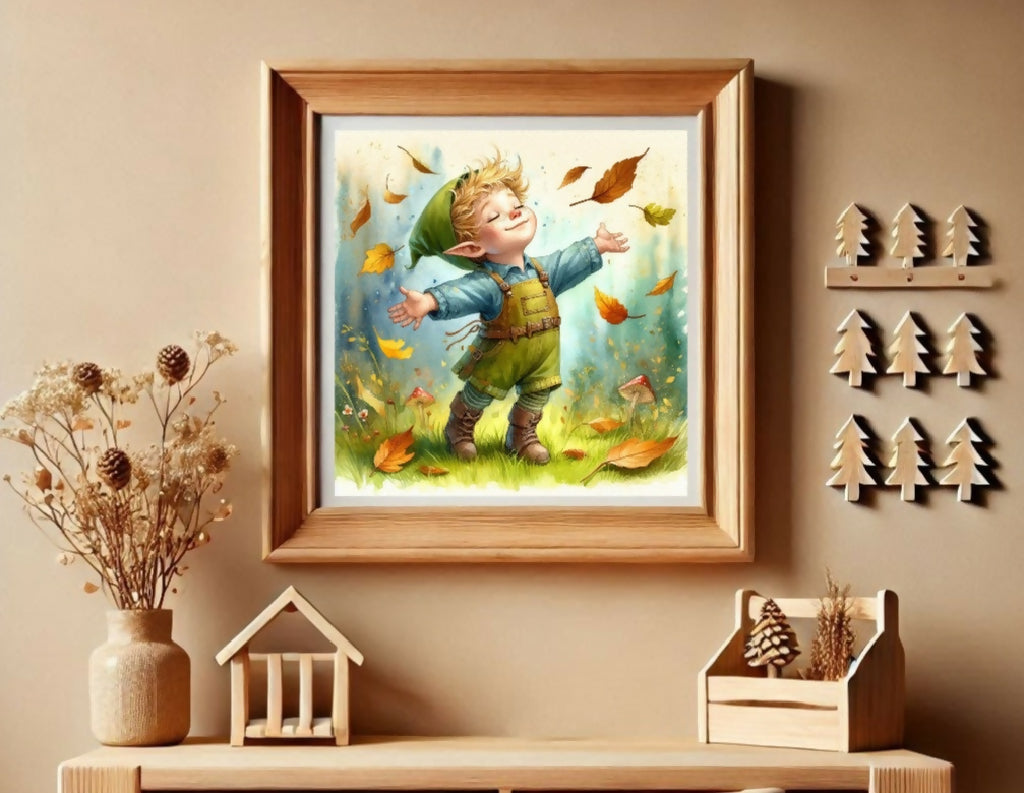 Ein Elfenjunge tanzt mit fliegendem Herbstlaub auf einer Wiese.
