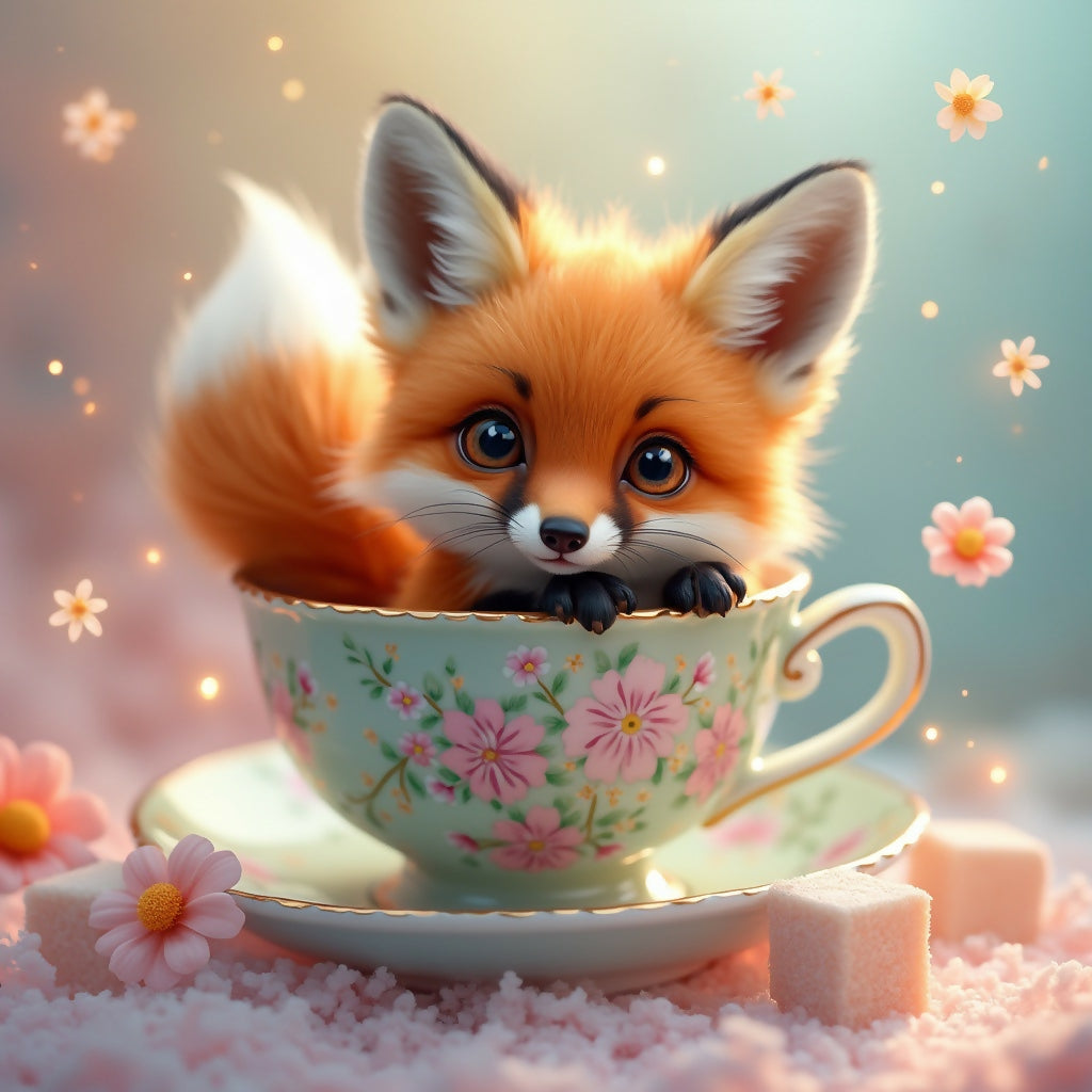 This charming creation features an adorable, fluffy fox nestled snugly inside a delicate porcelain teacup. The teacup is adorned with intricate floral patterns in soft pastel tones, adding a touch of elegance to the scene. The fox, with its warm orange fur and curious expression, looks perfectly cozy, its bushy tail curling around the rim of the cup. A few scattered tea leaves and petals lie nearby, completing the quaint and playful vibe. Perfect for lovers of cozy and imaginative designs, this piece brings a heartwarming touch of whimsy to everyday life.