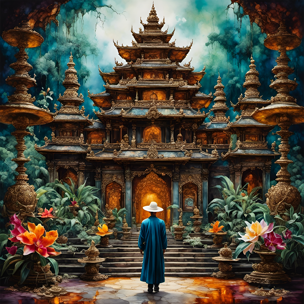 Majestic digital artwork featuring a grand golden temple in Thailand, gleaming under the sunlight. A man with a hat stands at its entrance, adding a sense of scale and cultural exploration to the serene scene.