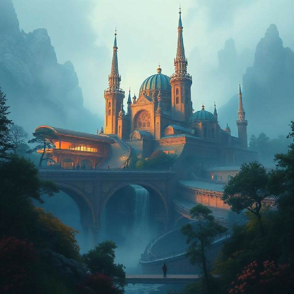 A majestic temple with soaring spires and domes stands nestled amidst a misty landscape. The temple is built into the side of a mountain, with waterfalls cascading from its arches. The scene evokes a sense of serenity and wonder.