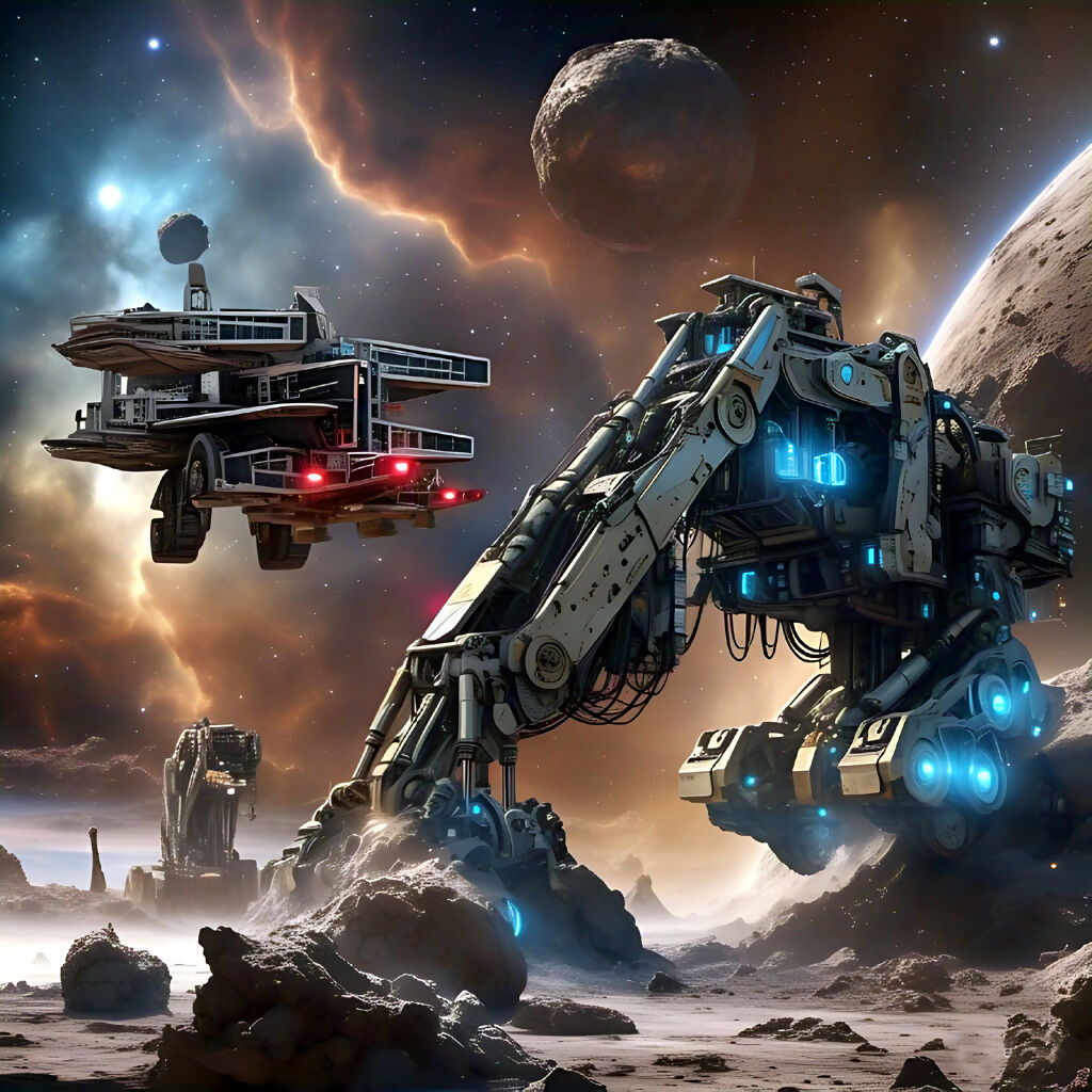 In the distant reaches of the galaxy, where starlight dances across alien soil, a fleet of autonomous excavators reshapes the terrain of a newly discovered planet. Terraform Titans: Excavators of the Outer Rim captures a pivotal moment in interstellar colonization—where robotic pioneers carve civilization into the unknown. The glowing blue limbs of the multi-legged machine pulse with energy as it manipulates the rocky surface, while a hovering spacecraft prepares for descent. This AI-generated artwork blends cosmic wonder with mechanical precision, inviting viewers into a future where exploration is led not by humans, but by intelligent machines. A perfect fusion of sci-fi storytelling and visual spectacle.