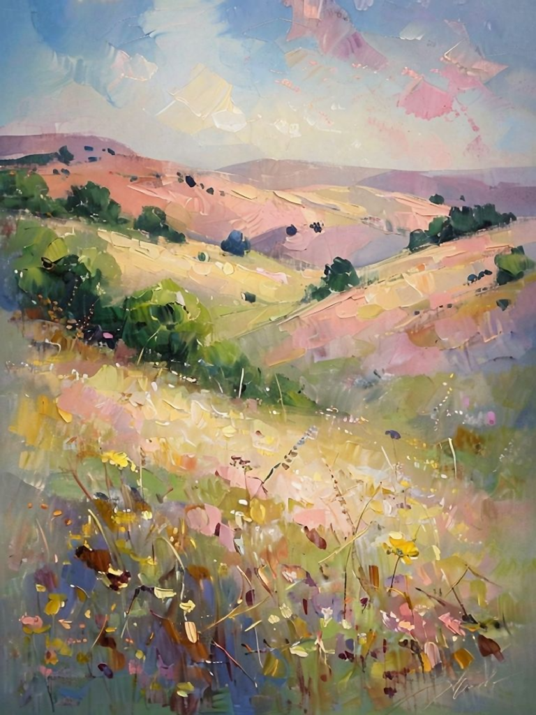 Immerse yourself in the serene beauty of nature with this stunning digital art print featuring a vibrant impressionist landscape. This high-quality printable artwork showcases rolling hills, a picturesque meadow, and an expansive sky, rendered in a textured oil painting style that evokes depth and emotion. Perfect for adding a touch of modern art and peaceful scenery to any room.