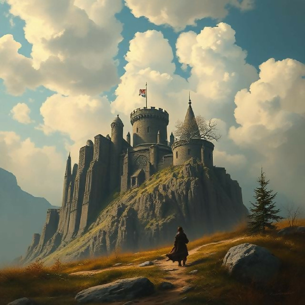 This artwork depicts a grand, imposing stone castle perched majestically atop a rugged hill, dominating the landscape. A single figure, seen from behind, walks along a path leading upwards towards the castle, suggesting a journey or pilgrimage. The sky above is filled with soft, voluminous clouds, and a small flag flies from one of the castle's towers. A lone pine tree stands on the right, providing a touch of green amidst the rocky terrain. The overall impression is one of medieval grandeur and aspiration.