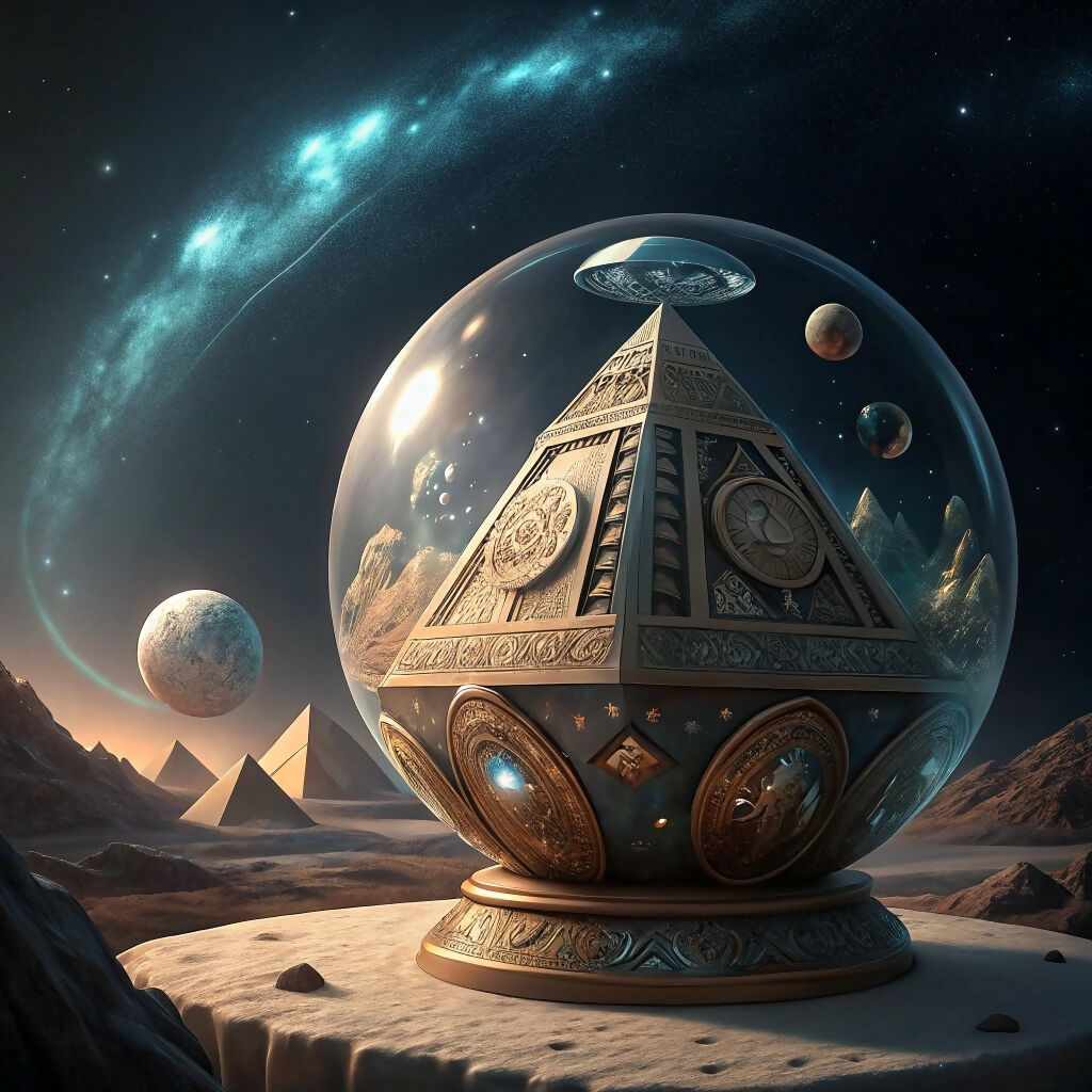A large, ornate, golden pyramid-shaped structure is contained within a clear glass sphere.