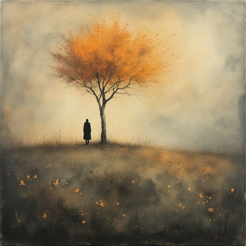 A solitary figure, cloaked in darkness, stands beneath the boughs of a tree ablaze with vibrant orange leaves.
