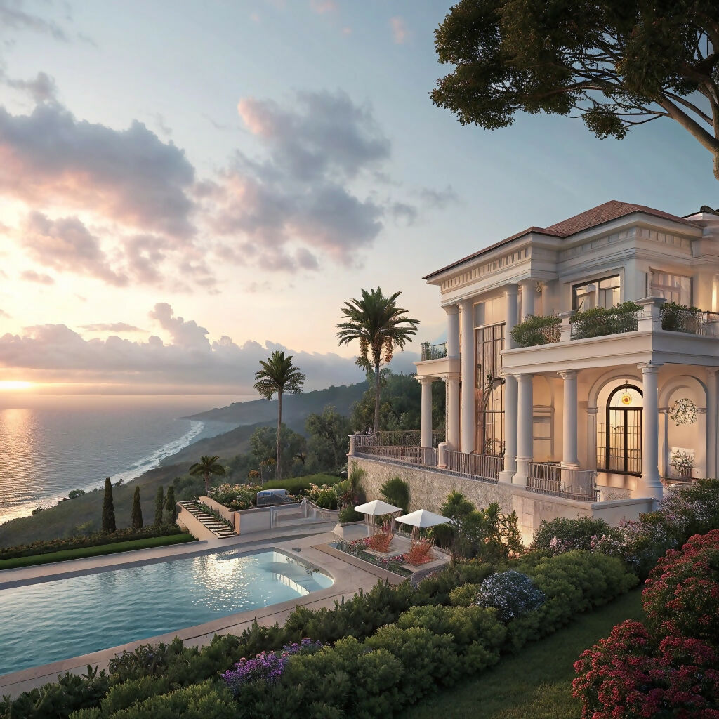The image depicts a house with a pool surrounded by lush greenery and trees. In the background, there is a body of water reflecting the sky, which is adorned with clouds during sunset or sunrise. The scene suggests a serene outdoor setting, typical of a resort or luxury villa.