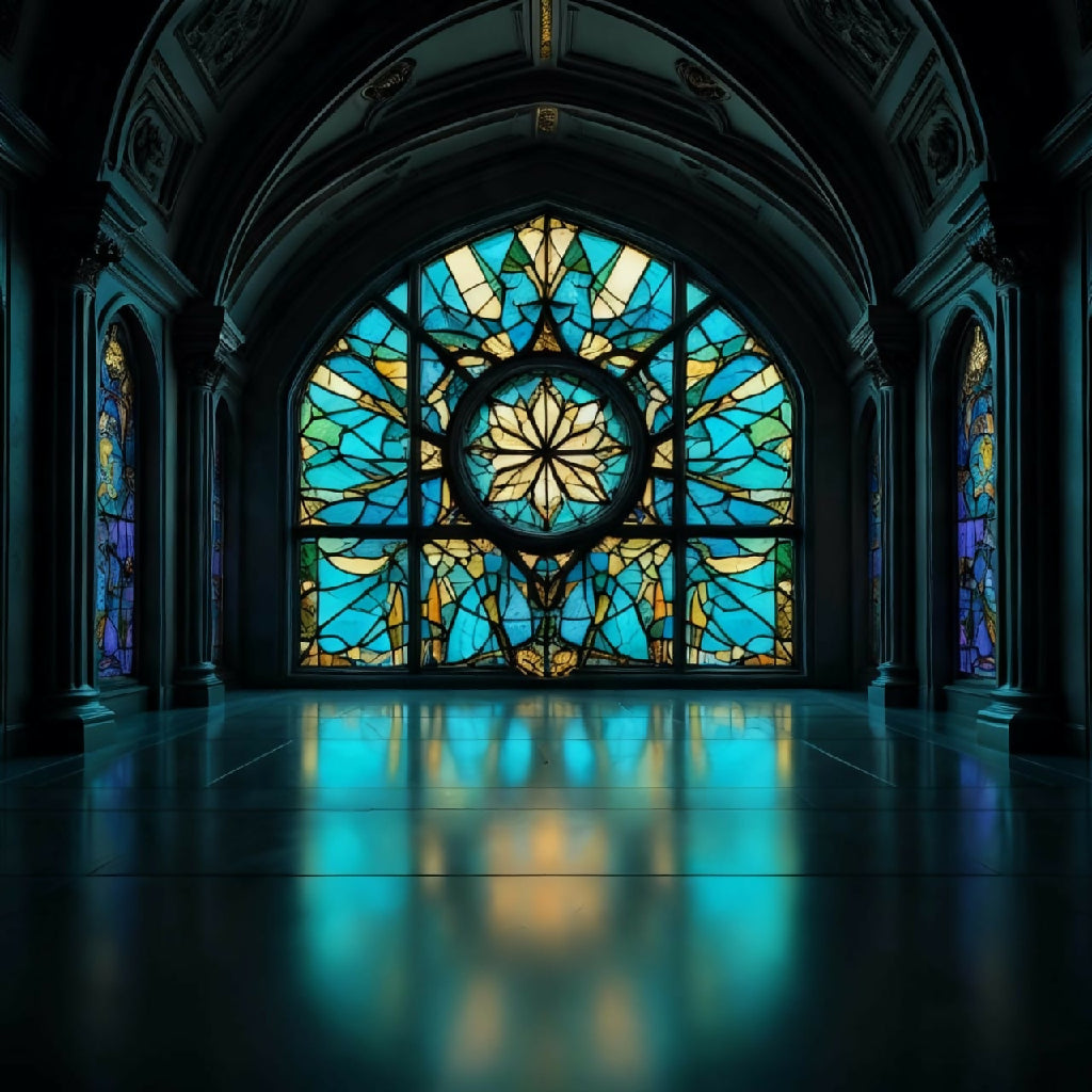 A profound reflection of spiritual and material light. This exclusive artwork captures The Azure Sanctuary, showcasing a majestic stained-glass rose window that casts luminescent teal and gold onto polished marble. It is the essential acquisition for the collector who possesses deep history, architectural brilliance, and unyielding illumination.