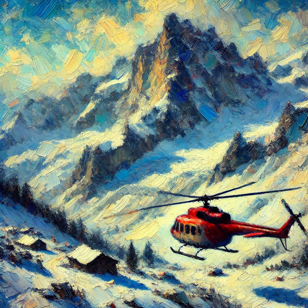 The use of colors is striking, with the contrast between the bright red of the helicopter and the cool whites and blues of the snowy landscape. This contrast not only highlights the helicopter as the focal point but also adds depth and vibrancy to the painting.