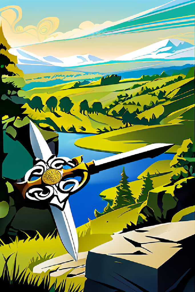 A mystical blade rests in an ancient stone, overlooking a lush and vibrant Celtic landscape. The sword’s ornate design suggests it holds great power, possibly linked to a forgotten legend or a heroic destiny. The flowing rivers, winding hills, and distant peaks create an enchanting atmosphere, evoking the rich mythology of Ireland and the spirit of adventure.