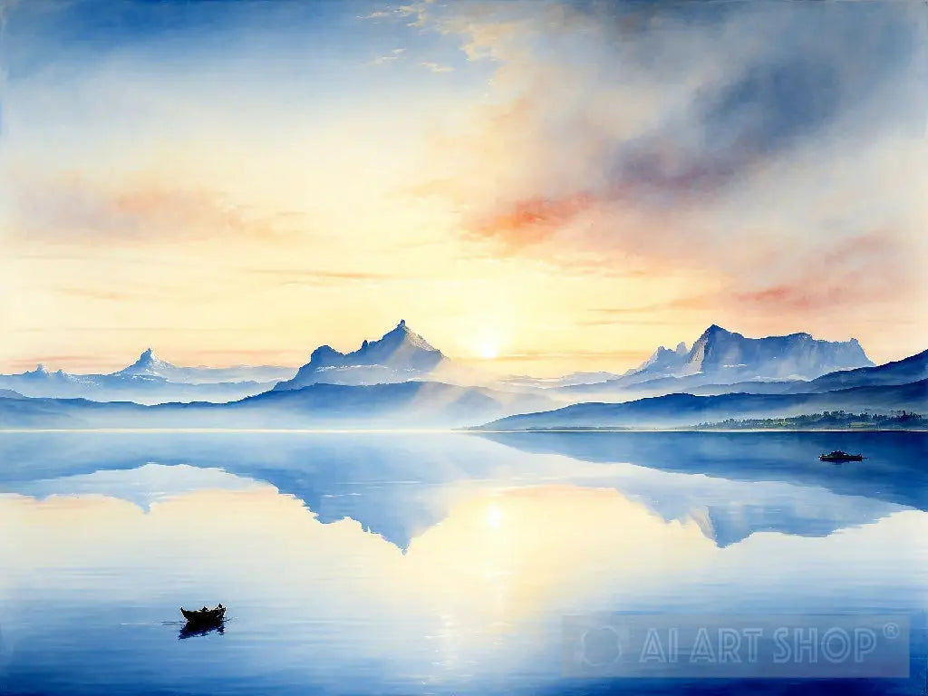 This watercolor painting captures the serene beauty of Mount Rigi in Switzerland at sunrise. The delicate use of color and light creates a tranquil and ethereal atmosphere, with the mountain reflected in the still waters of Lake Lucerne.