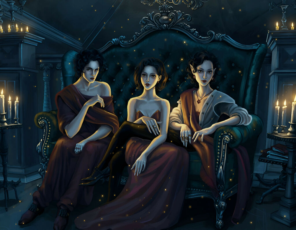 “An atmospheric digital painting of three elegant figures illuminated by candlelight, evoking a gothic and mysterious mood.”