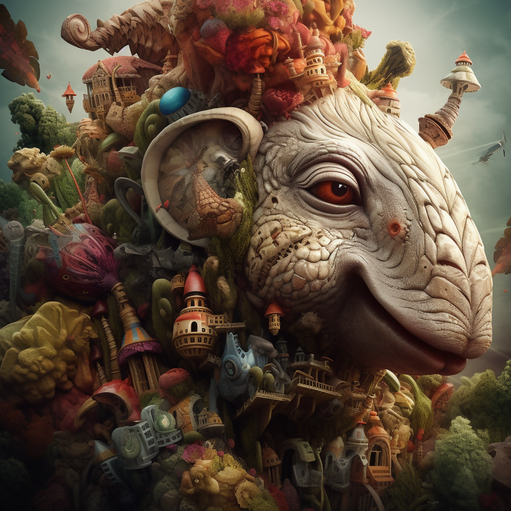 A fantastical creature that merges the organic with the architectural: part beast, part city. Its massive body resembles a mythic dinosaur or ram, while its head supports towers, domes, and homes as if they were natural extensions of its being. Floating among vibrant vegetation and suspended structures, this piece evokes impossible worlds where life and civilization intertwine. Generated with AI, it invites viewers to explore the surreal and symbolic.