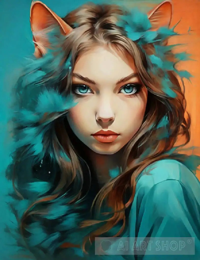 A picture of a girl's face with heavy eyelashes and turquoise eyes inside a picture of a cat's head colored in attractive, natural colors.