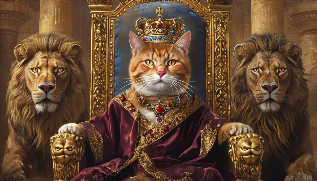an AI generated artwork of king cat on the throne guarded by lions.