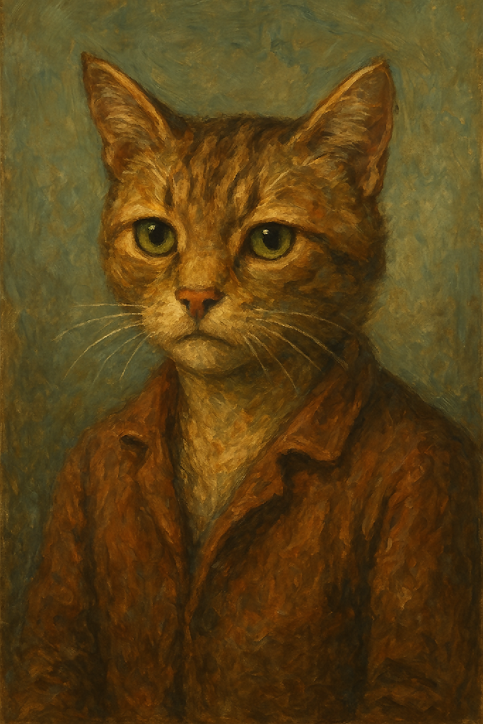 A cat dressed as a human stares deeply into the viewer's eyes, as if frozen in a hand-painted portrait.