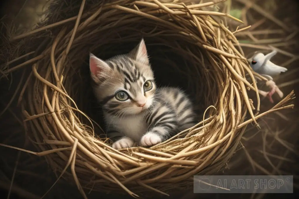 A painting that shows the innocence and beauty of a little cat while it is inside a bird’s nest, which shows the harmony of tenderness and innocence of cats and birds, which is embodied in this picture.