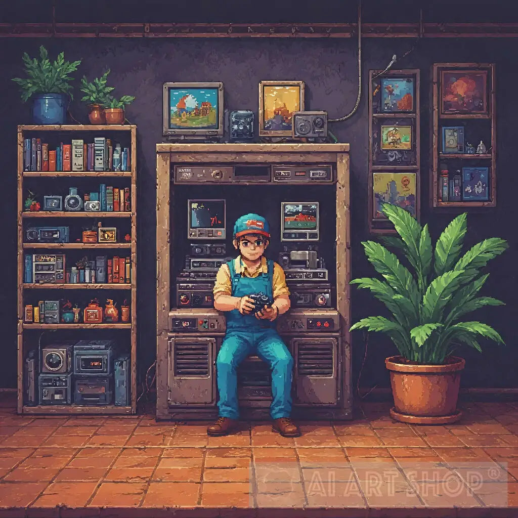 In a quaint little shop nestled in the heart of a bustling town, a pixel art depiction captures the innocence and wonder of a child as they explore the treasures within.