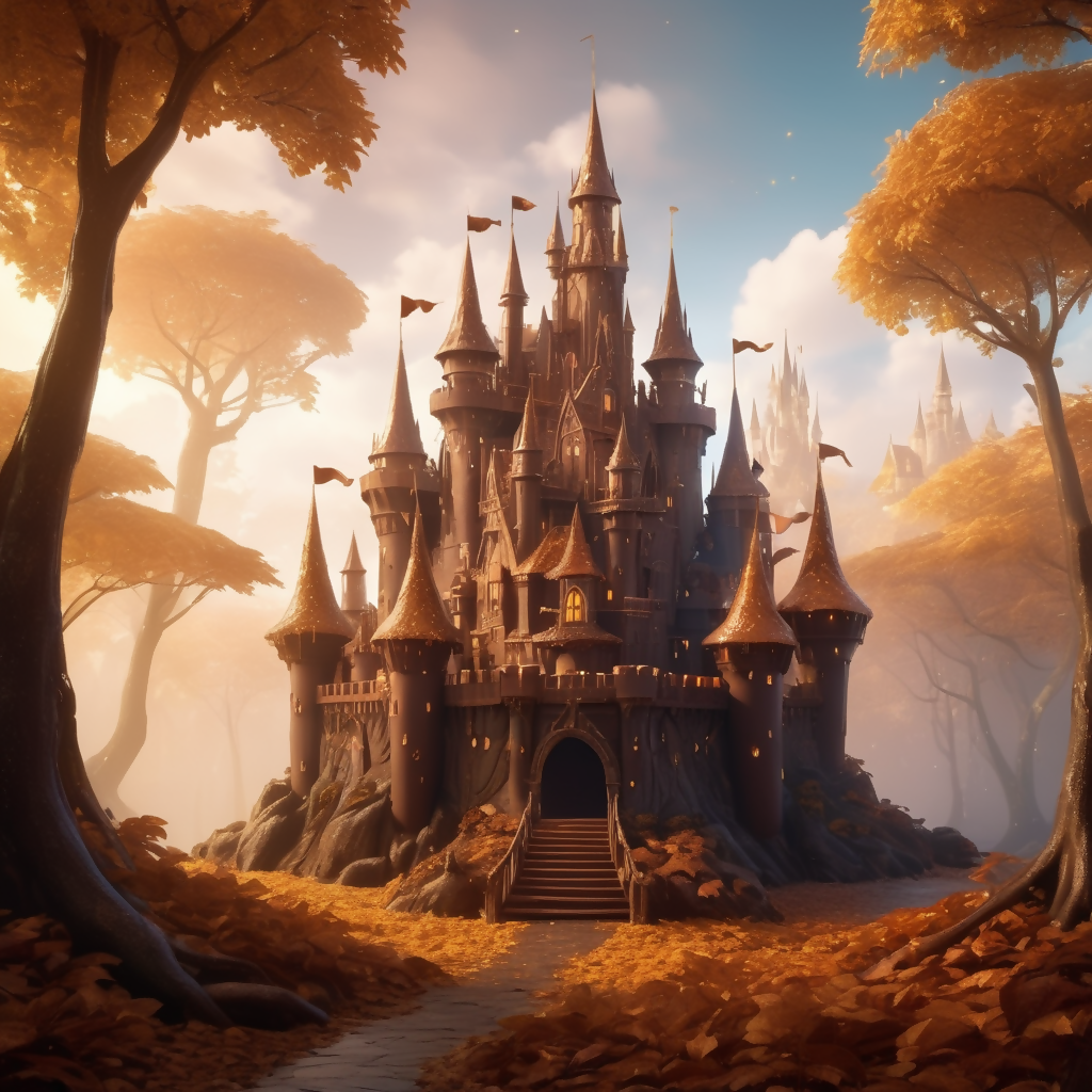 An enchanting castle made entirely of chocolate, standing in a misty fantasy forest. The walls drip with caramel light, and the sky glows with golden cocoa hues — a magical kingdom where everything is made of sweetness.