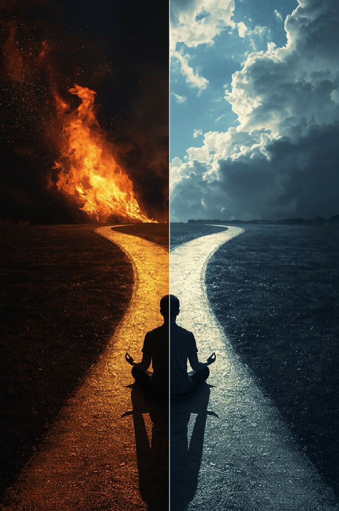 The Choice Point A person sits in meditation at a crossroad of light and shadow