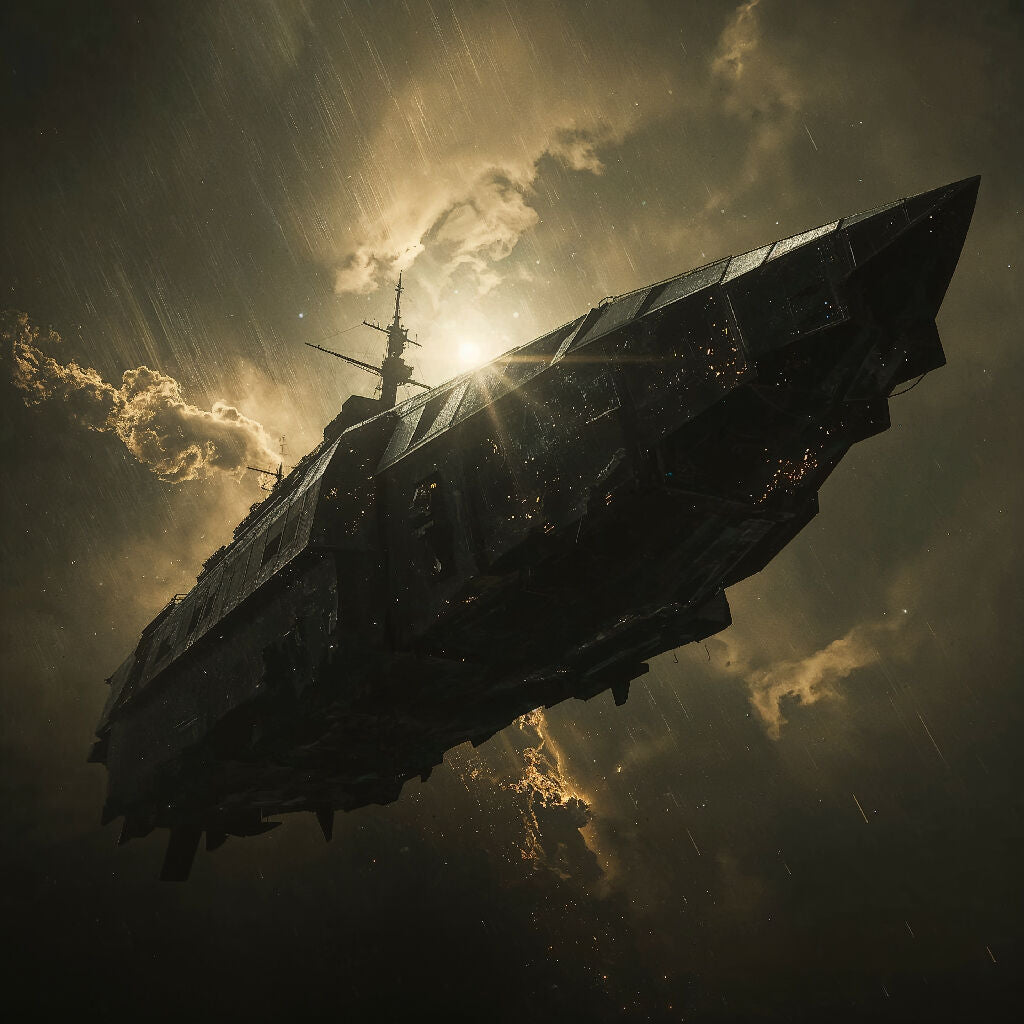 A colossal vessel breaches storm-torn clouds, its hull scarred by celestial warfare and temporal erosion. Rain streaks across its metal skin like tears of the sky, while divine light pierces through atmospheric chaos to illuminate this aerial cemetery. The ship's massive form suggests both technological achievement and mythological creature, a mechanical whale swimming through heavens instead of oceans. The composition explores themes of ambition's aftermath and the sublime terror of human engineering confronting cosmic forces. This is progress transformed into monument, where our greatest achievements become beautiful ruins drifting through eternity.