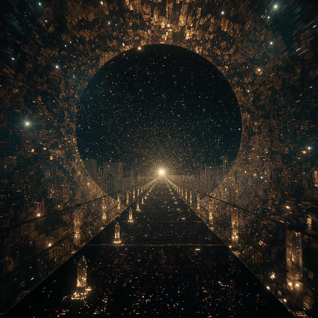 A monumental tunnel constructed entirely of illuminated cubic forms extends toward an impossibly distant vanishing point, creating a vertiginous perspective that challenges spatial comprehension. Golden light emanates from countless individual units, suggesting an infinite repository of knowledge or memory. The architectural structure evokes both digital data matrices and ancient libraries, bridging technological and classical conceptions of preservation. The symmetrical composition and rhythmic repetition create a meditative quality, while the dark void at the center represents the unknown—that which lies beyond accumulated wisdom. This corridor speaks to humanity's eternal quest to contain, organize, and traverse the immeasurable.