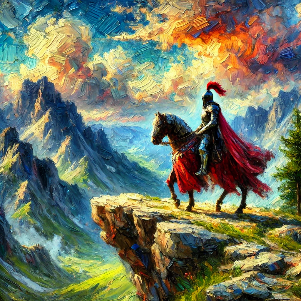 The painting effectively conveys a sense of heroism and solitude. The knight symbolizes medieval adventure and courage, while his stance at the edge of the cliff evokes a moment of contemplation or readiness for a challenge.