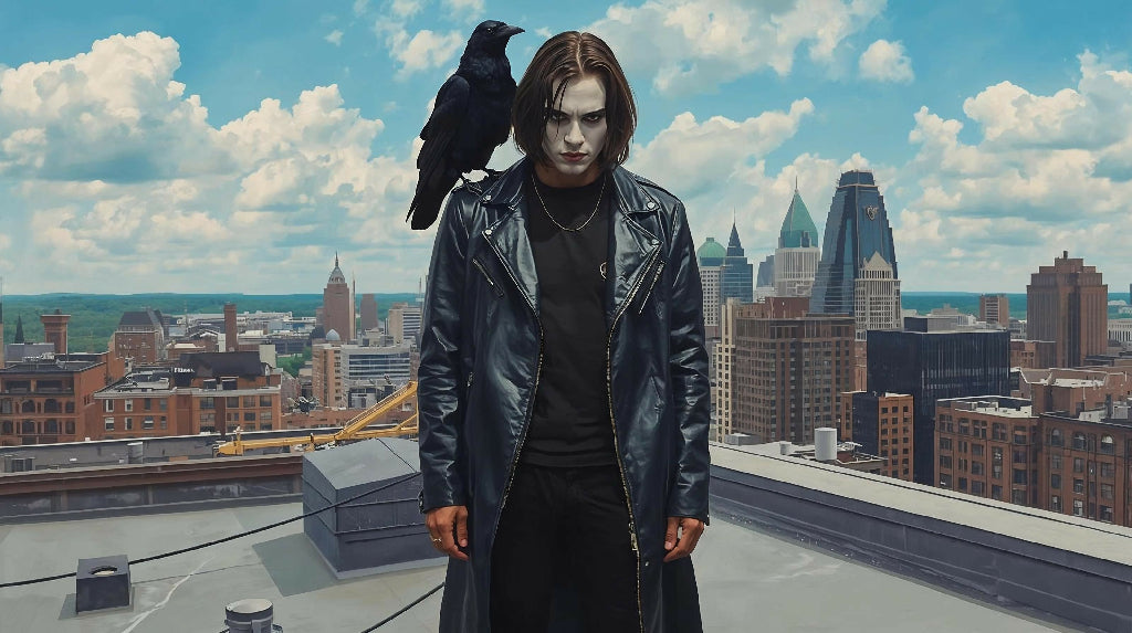 Vivid painting of The Crow on a rooftop with the city of Detroit in the background.