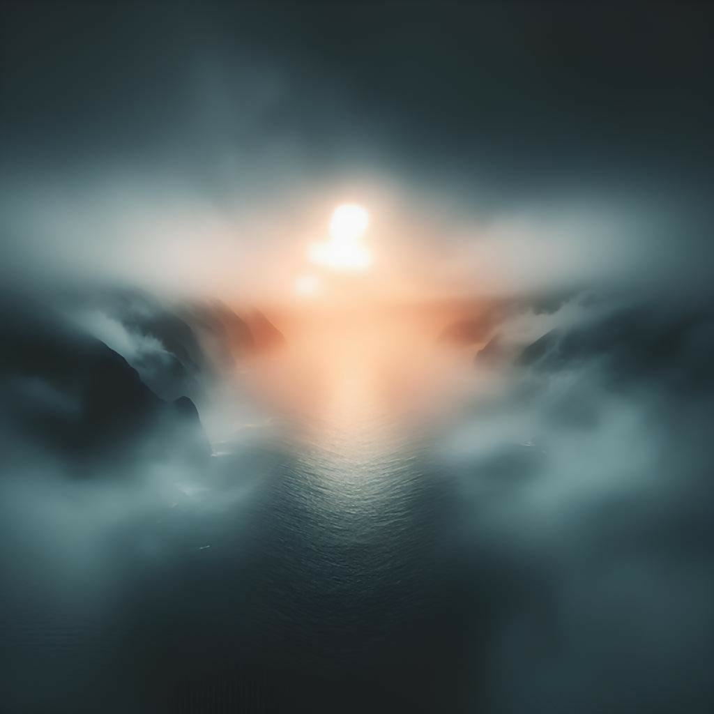 This atmospheric digital artwork captures the serene beauty of a rising sun veiled by ocean fog. A dreamy fusion of light and mystery, inviting viewers to explore the calm, poetic silence of a new beginning.