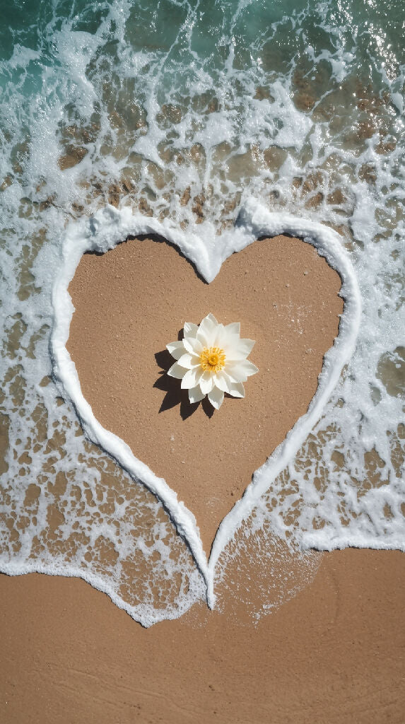 The delicate and rich image shows an aerial photograph of a beach with ocean waves. The waves form a large heart of white foam on the sand, and in the center of the heart is a large white lotus flower. I see it next to you at my height. The seawater outside the heart has a turquoise hue.