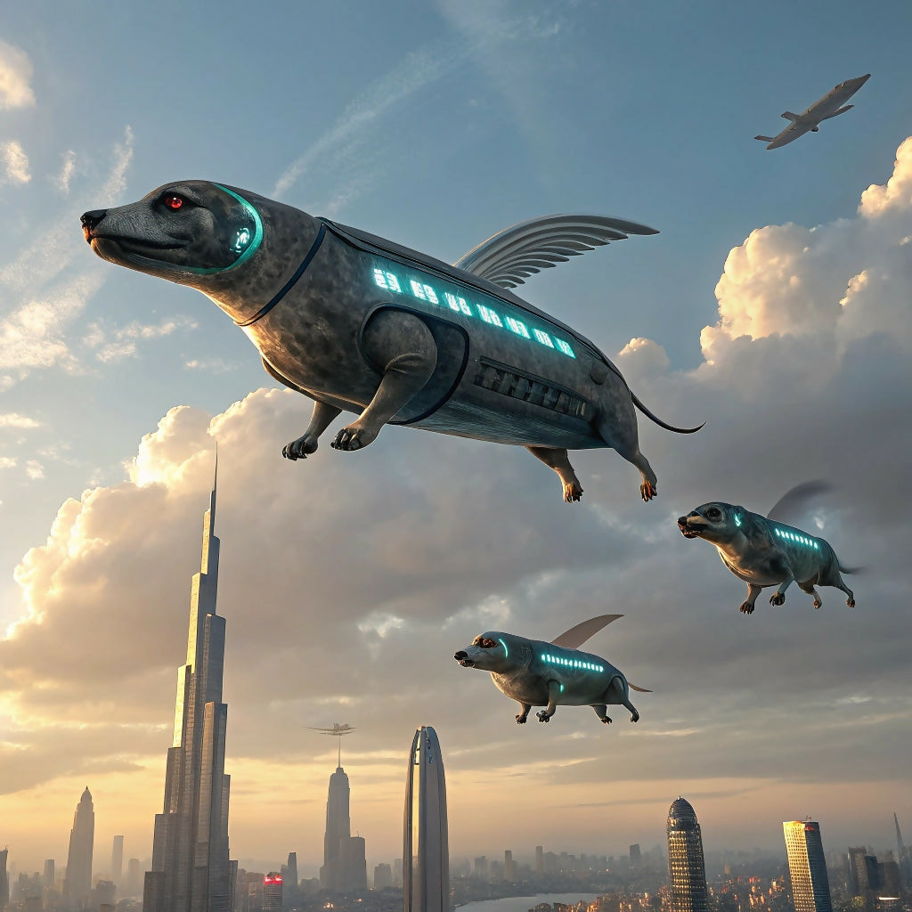 An exclusive, visionary masterpiece that captures the pinnacle of futuristic luxury. This surreal artwork transports you to a world where whimsy and technology collide, as elegant winged automatons soar over a dazzling metropolis at dawn. This is not just a picture; it is a statement of unparalleled imagination for the discerning collector of the extraordinary.