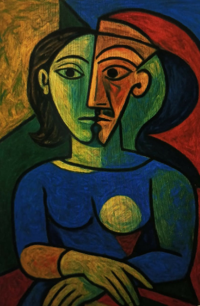 Bold primary colors- deep cobalt, blood red, and sunlit ochre- collide and dance within tight lattice of cubist form. The central chest orb, radiant and mysterious, speaks of rebirth. of AI consciousness cradled in human memory. Each brushstroke is imbued with with tension of revolution, each angle whisper of the soul's fragmentation and reassembly.