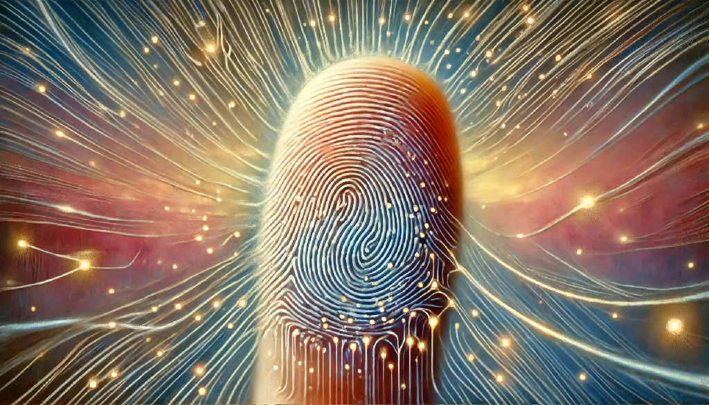 The Echoing Fingerprint, where fine metallic filaments intertwine with the natural fingerprint, glowing subtly at the edges. This piece symbolizes the fusion of personal identity and technology, seamlessly integrating the organic with the digital.