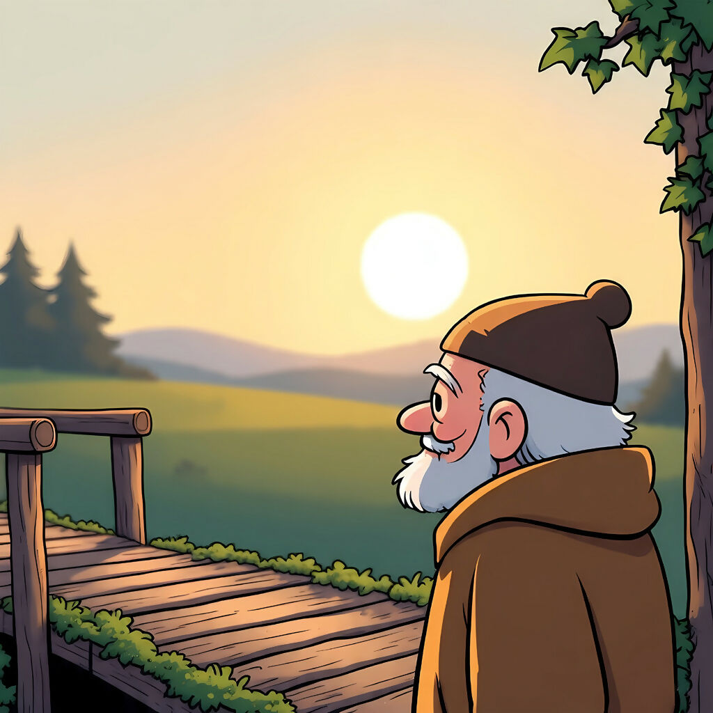 This serene AI artwork depicts an elderly man with a white beard, dressed in a humble cloak and beanie, standing near a rustic wooden bridge as the sun sets over rolling hills. The warm glow of the horizon symbolizes wisdom, reflection, and the passage of time. The pine trees and tranquil landscape create a peaceful atmosphere, inviting viewers to pause and contemplate life’s journey. The story behind this piece is one of quiet resilience—an elder gazing toward the fading light, embodying the beauty of reflection and the timeless bond between humanity and nature.