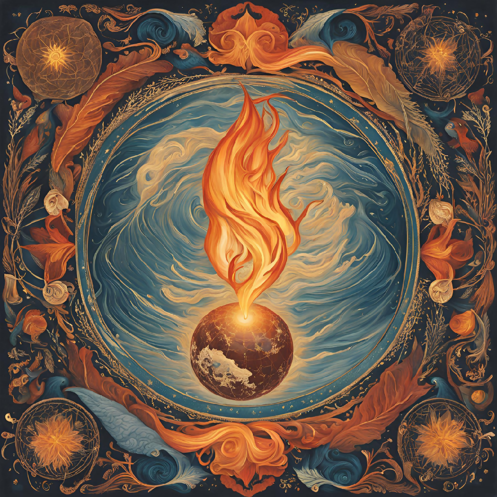 Mystical Symbolism: The cosmic themes, celestial elements, and the glowing flame suggest an esoteric or spiritual meaning, often found in mystical and alchemical art.